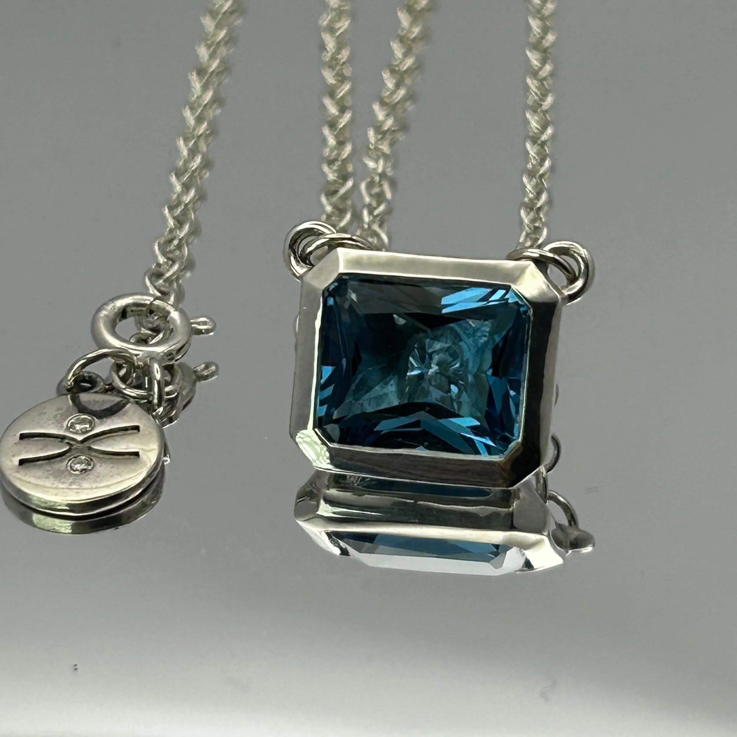 Signature Collection - a unique piece of Jewellery. A stunning 5.47ct Octagon cut London Blue Topaz set in sterling silver with a hidden round 3mm diamond (lab grown E/F colour VS) on a 18” sterling silver trace chain with loops at 16” and 14”. Supplied with logo plate set with 2 small lab grown diamonds.