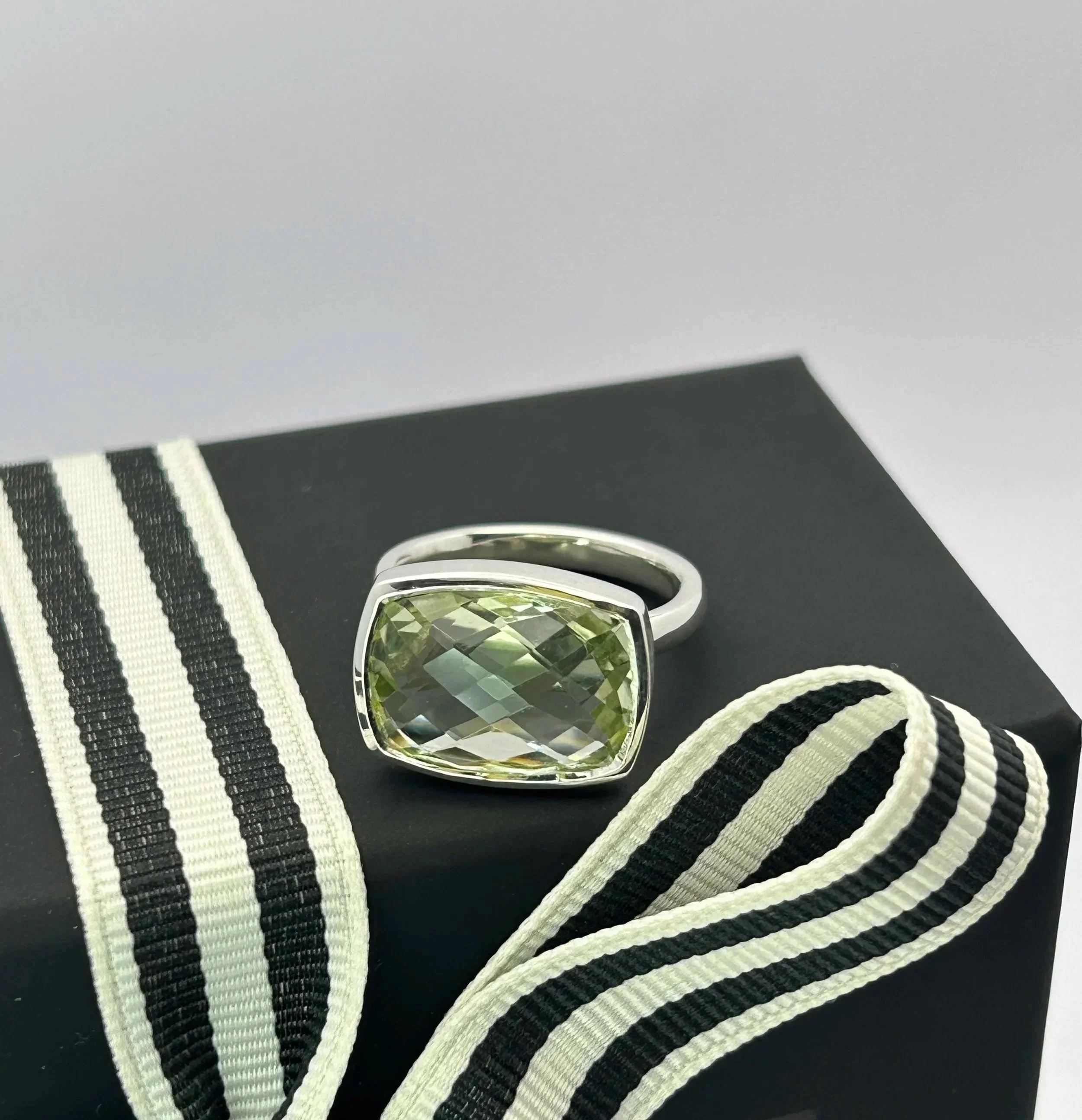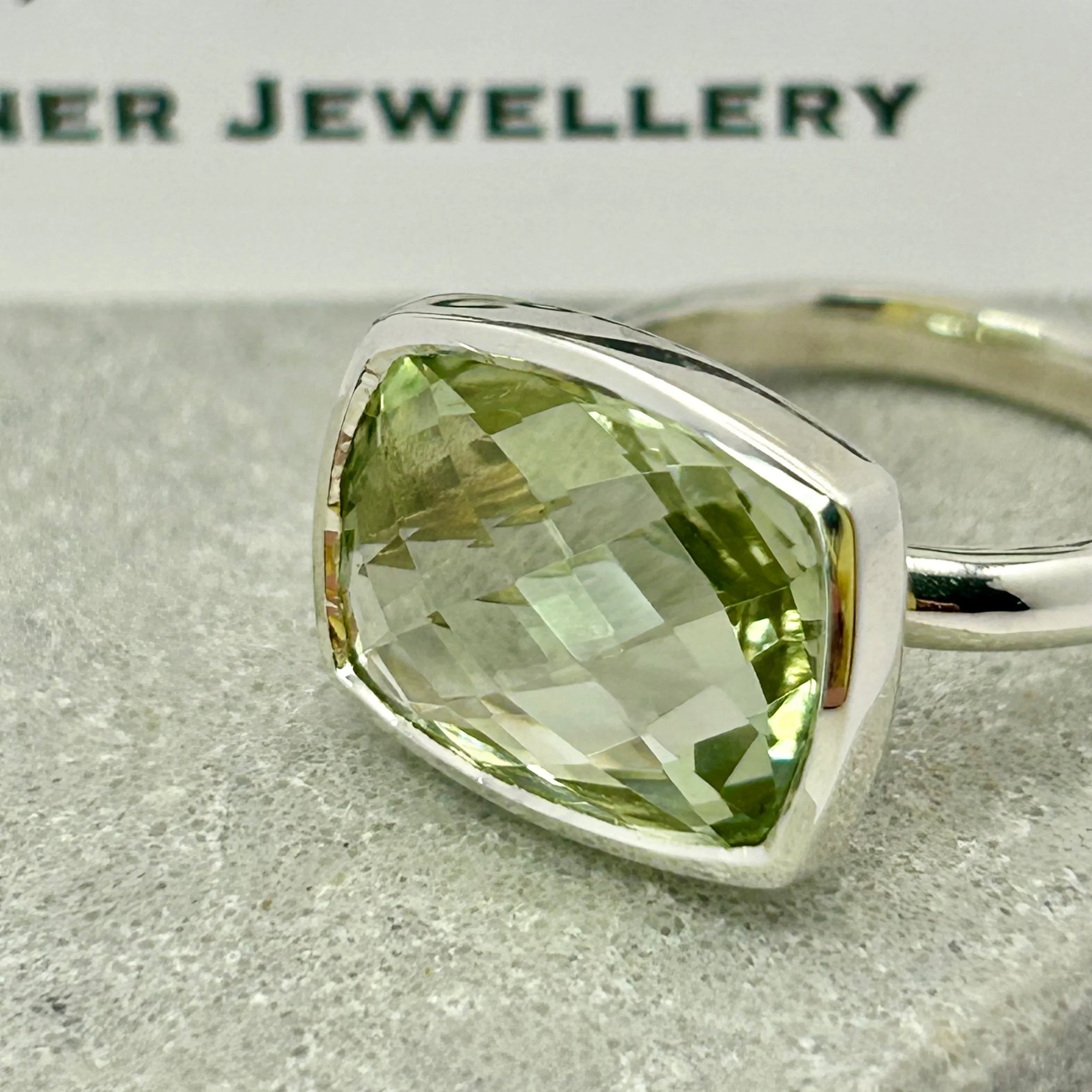 Signature Collection - a unique piece of Jewellery. Stunning lime citrine chequerboard cut gemstone (8.85 ct) in a sterling silver ring utilising our signature setting. Hallmarked and in size ‘P’ (This ring can be sized to ‘O’ or ‘Q’ please contact us if required).