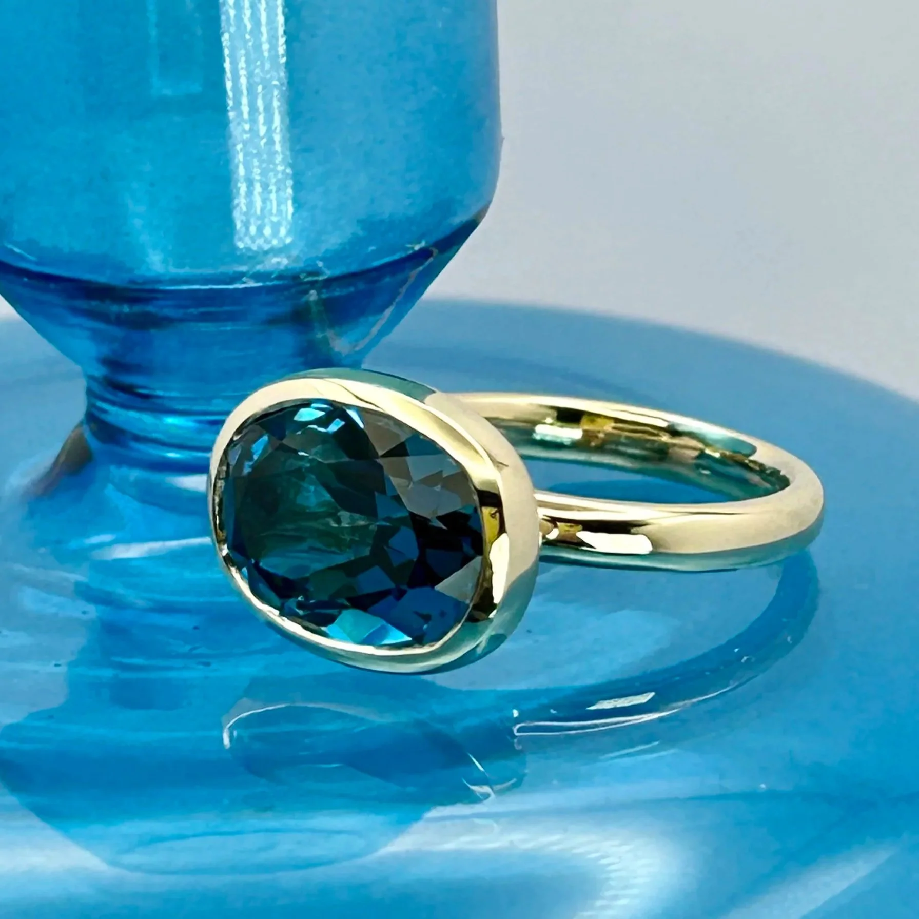 Signature Collection - a unique piece of Jewellery. Stunning London Blue topaz oval cut gemstone (8.10ct) in a 9kt yellow gold ring utilising our signature setting. Hallmarked and in size ‘O’ (This ring can be sized to ‘N’ or ‘P’ please contact us if required).